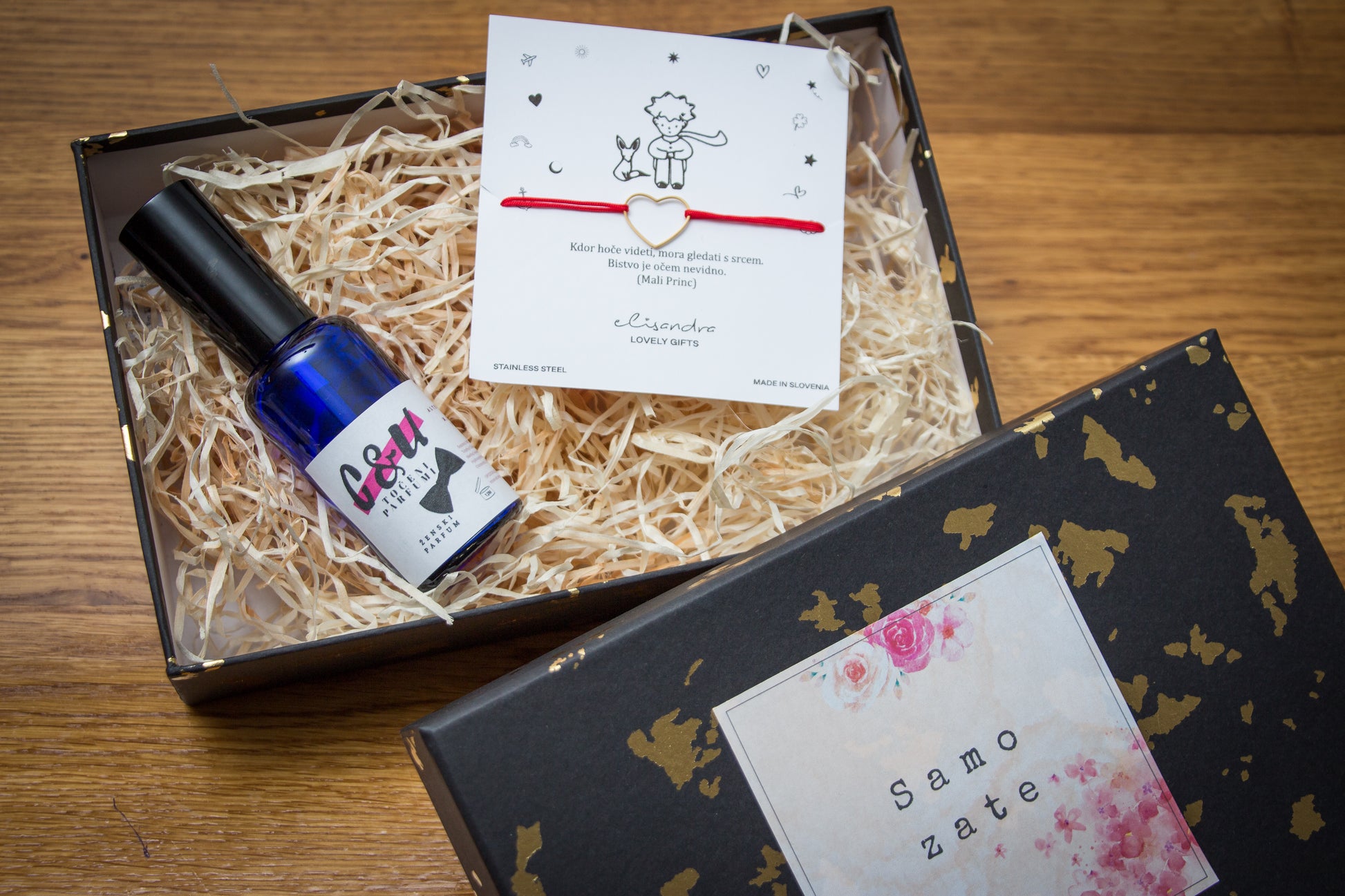 - Parfum po izbiri, katerega sami dodate v košarico, cena parfuma se prišteje k darilnemu paketu