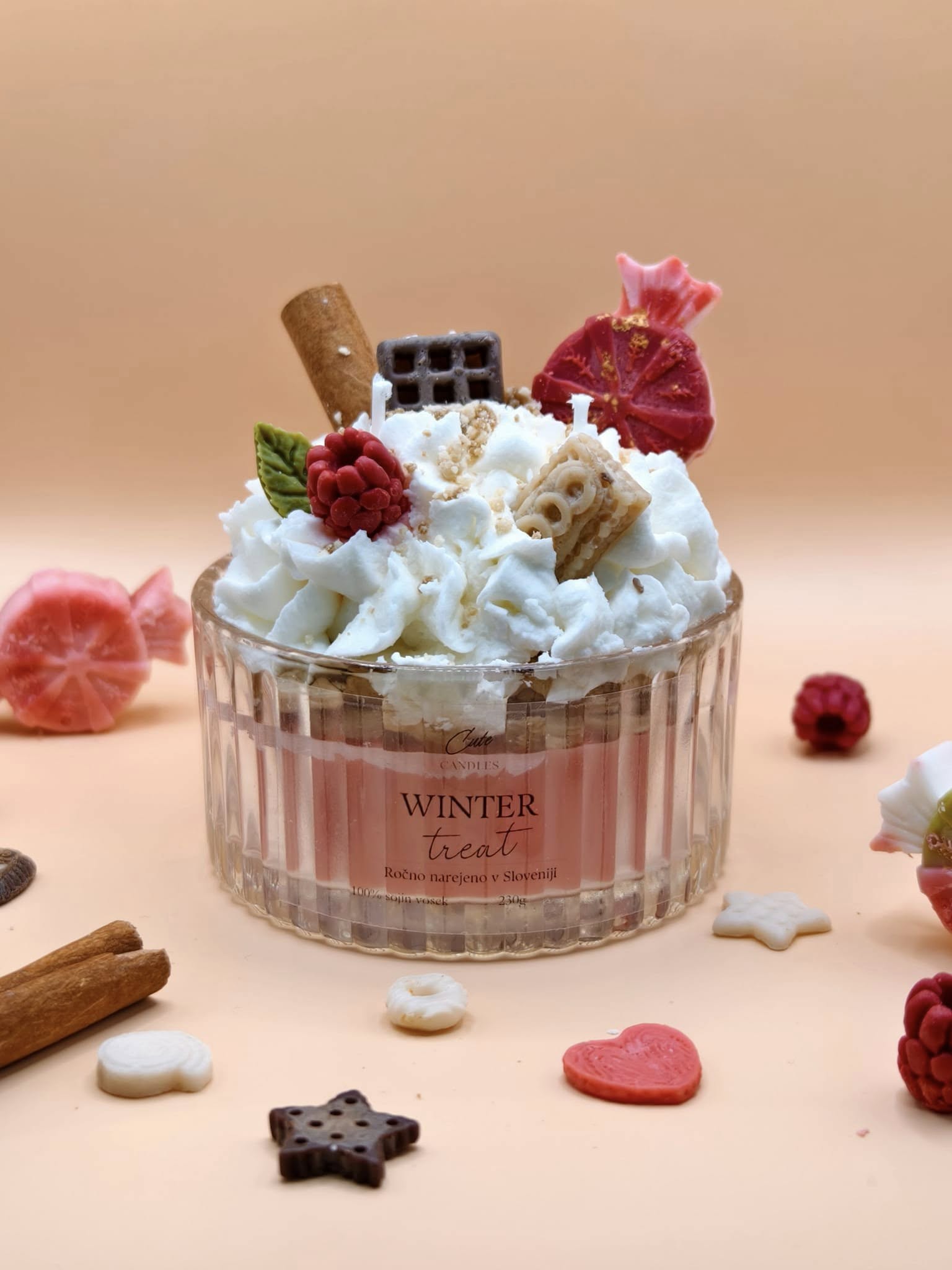 WINTER TREAT izgleda za "prste obliznit" anti LCHF sladica, gre za ročno izdelano svečko iz 100% naravnega sojinega voska z vonjem sladke sladice.